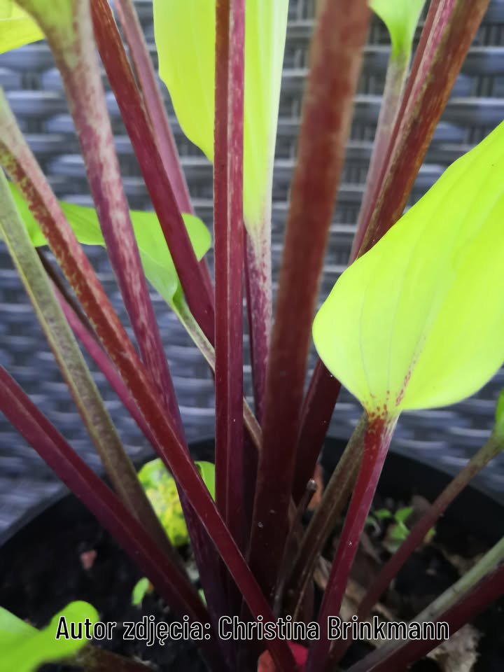 Piękna odmiana o jaskrawożółtych liściach z lekko pofalowanym brzegiem, osadzonych na intensywnie bordowych ogonkach liściowych.