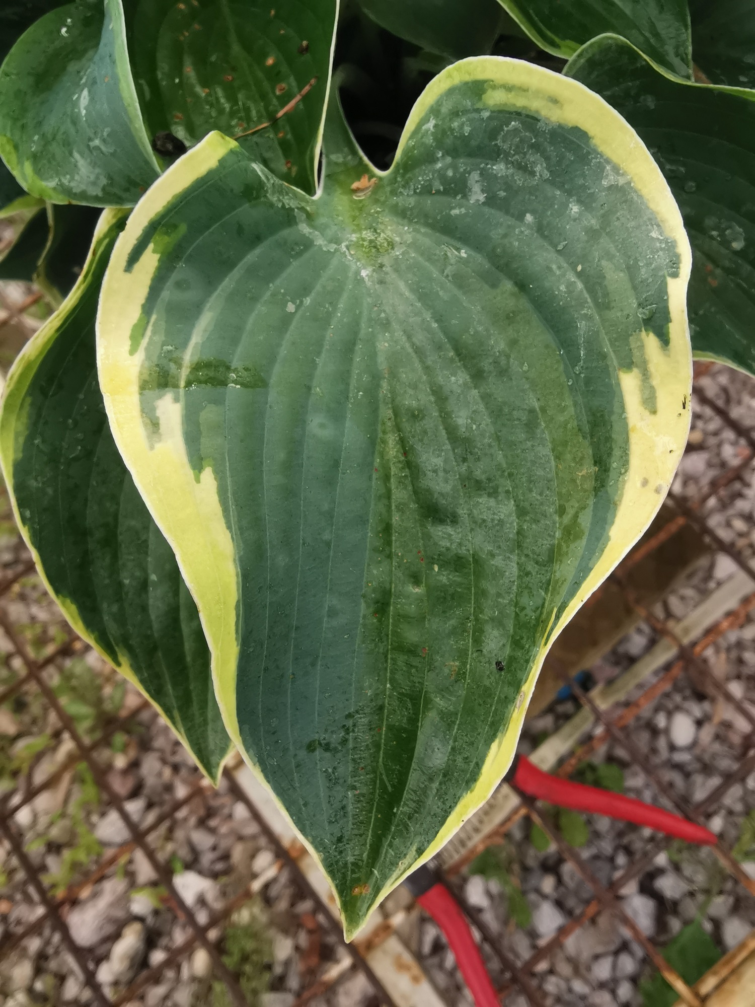 Liście: szerokoowalne, w podstawie sercowate, u nasady „nieckowate’ długości 10 cm i szerokości 8 cm, lekko pofalowane, matowe, zielononiebieskie, z dość szeroką (0.6cm) kremowobiałą obwódką, pokryte nalotem woskowym.
